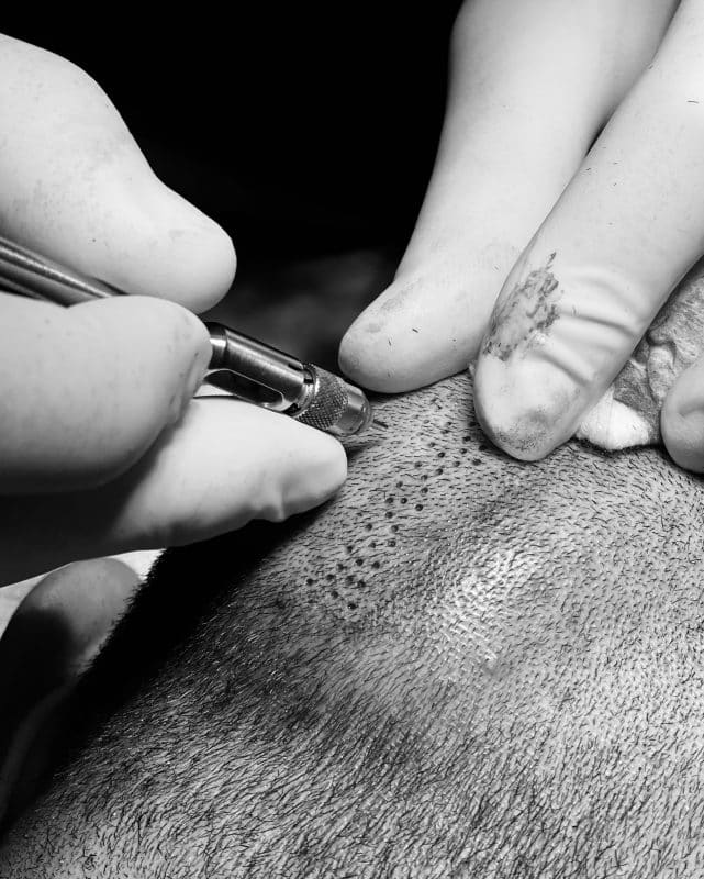4. Implantation des greffons – Anesthésie locale de la zone receveuse, réalisation de micro-fentes précises et implantation des greffons pour un résultat naturel et discret.