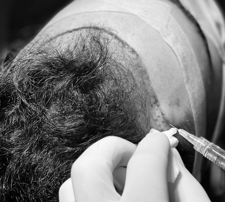1. Anesthésie de la zone donneuse – Réalisée à l’arrière du crâne, elle permet un prélèvement totalement indolore.